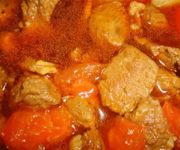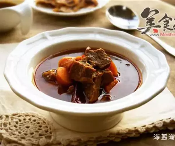 2、油烧热 后将葱、姜爆香,再加入辣豆辨酱炒红,然后放入牛肉块翻炒并加入酱油、糖、胡椒粉、酒、味精及八角,最后加水浸过牛肉,用小火慢慢煮至汁稠、肉酥香即可。