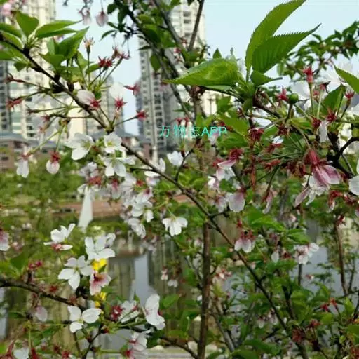 山樱花(学名:Cerasus serrulata (Lindl.) G. Don ex London):乔木,高3-8米,树皮灰褐色或灰黑色。小枝灰白色或淡褐色,无毛。冬芽卵圆形,无毛。叶片卵状椭圆形或倒卵椭圆形,上面深绿色,无毛,下面淡绿色,无毛。花序伞房总状或近伞形,有花2-3朵;总苞片褐红色,倒卵长圆形;花瓣白色,稀粉红色,倒卵形,先端下凹;雄蕊约38枚;花柱无毛。核果球形或卵球形,紫黑色。花期4-5月,果期6-7月。