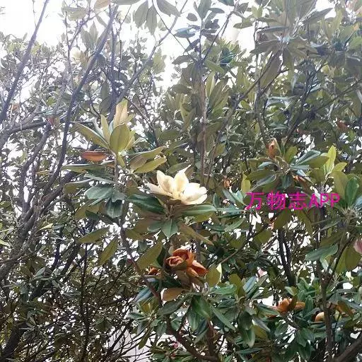 荷花玉兰(学名:Magnolia grandiflora L):常绿乔木,在原产地高达30米;树皮淡褐色或灰色,薄鳞片状开裂;小枝粗壮。叶厚革质,椭圆形,长圆状椭圆形或倒卵状椭圆形,叶面深绿色,有光泽。花白色,有芳香,直径15-20厘米;花被片9-12,厚肉质,倒卵形,长6-10厘米,宽5-7厘米。聚合果圆柱状长圆形或卵圆形,蓇葖背裂,背面圆,顶端外侧具长喙;种子近卵圆形或卵形,长约14毫米,径约6毫米,外种皮红色,除去外种皮的种子,顶端延长成短颈。花期5-6月,果期9-10月。