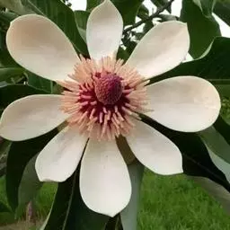 花白色,有芳香,直径15-20厘米;花被片9-12,厚肉质,倒卵形,长6-10厘米,宽5-7厘米;雄蕊长约2厘米,花丝扁平,紫色,花药内向,药隔伸出成短尖;雌蕊群椭圆体形,密被长绒毛;心皮卵形,长1-1.5厘米,花柱呈卷曲状。