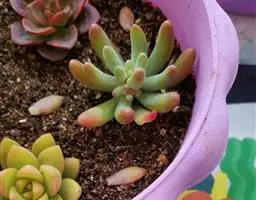 景天类采取扦插方法生根迅速,且不用蘸取生根激素,一般夏季7天即可生根,扦插后3至4周植株即开始生长,有的长出侧芽,有的在顶部接着原来的部分继续生长。切记,扦插生根阶段勿浇水过量,可保持基质偏干,每天光照至少达到12至14小时,这样生根更加迅速。