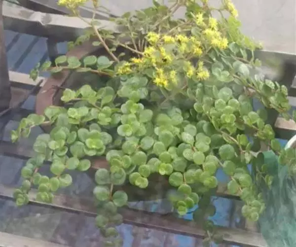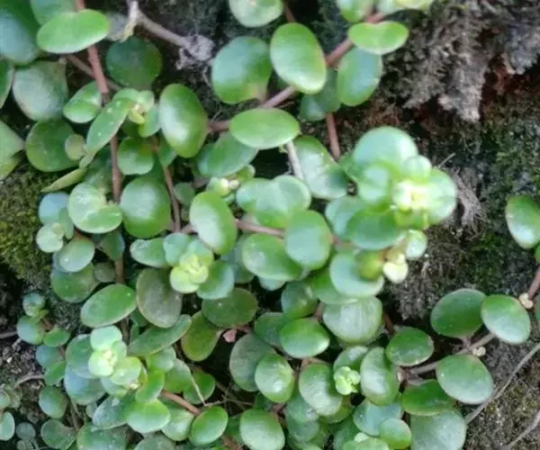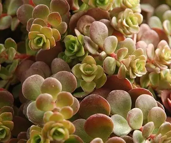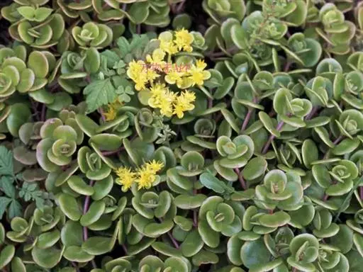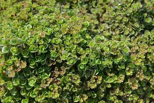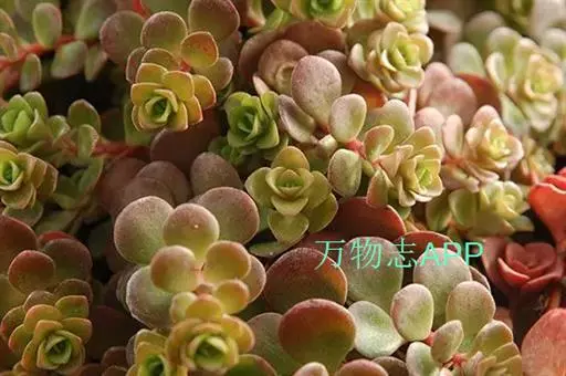 圆叶景天(Sedum sieboldii),景天科常绿多年生肉质草本植物,匍匐型生长,叶片对生,尖端钝圆,全光照条件下,叶片秋季变红,花瓣黄色或白色,花期4至6月。喜向阳和偏干环境,只要栽培在向阳、偏干的地方,就能茂盛生长;抗寒性强,病虫害较少。