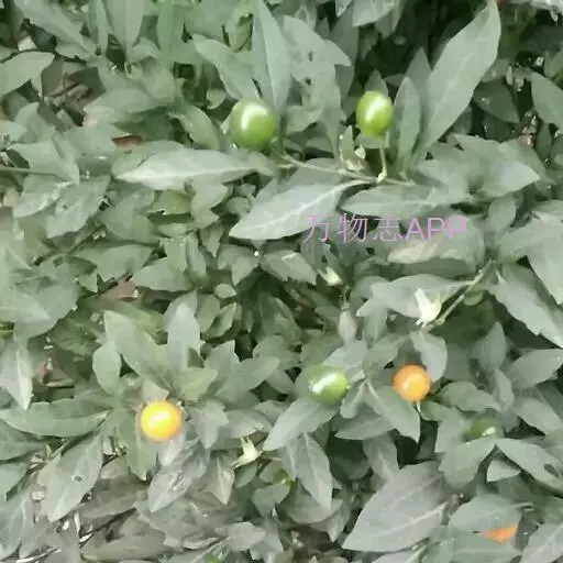 珊瑚豆(Solanum pseudocapsicum L. var. diflorum (Vell.) Bitter):直立分枝小灌木,高0.3-1.5米,小枝幼时被树枝状簇绒毛,后渐脱落。叶双生,大小不相等,椭圆状披针形,长2-5厘米或稍长,宽1-1.5厘米或稍宽,先端钝或短尖,基部楔形下延成短柄,叶面无毛,叶下面沿脉常有树枝状簇绒毛,边全缘或略作波状,中脉在下面凸出,侧脉每边4-7条,在下面明显;叶柄长约2-5毫米,幼时被树枝状簇绒毛,后逐渐脱落。花序短,腋生,通常1-3朵,单生或成蝎尾状花序,总花梗短几近于无,花梗长约5毫米,花小,直径约8-10毫米;萼绿色,5深裂,裂片卵状披针形,端钝,长约5毫米,花冠白色,筒部隐于萼内,长约1.5毫米,冠檐长约6.5-8.5毫米,5深裂,裂片卵圆形,长约4-6毫米,宽约4毫米,端尖或钝;花丝长约1毫米,花药长圆形,长约为花丝长度的2倍,顶孔略向内;子房近圆形,直径约1.5毫米,花柱长约4-6毫米,柱头截形。浆果单生,球状,珊瑚红色或桔黄色,直径1-2厘米;种子扁平,直径约3毫米。花期4-7月,果熟期8-12月。原产于巴西;在中国栽培,有时归化为野生种,见于河北、陕西、四川、云南、广西、广东、湖南、江西诸省。在四川、云南、广东、广西尤多见于田边、路旁、丛林中或水沟边,海拔1350-2800米地区常见,600米地区也有分布。果色鲜艳,可供观赏。
