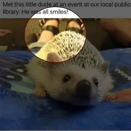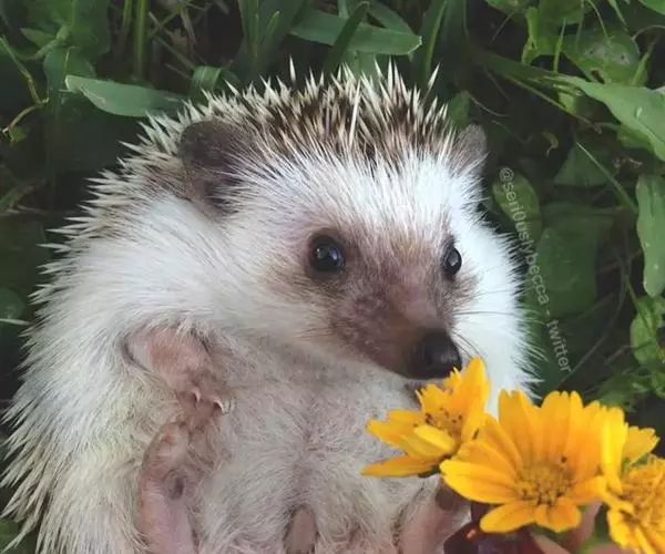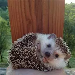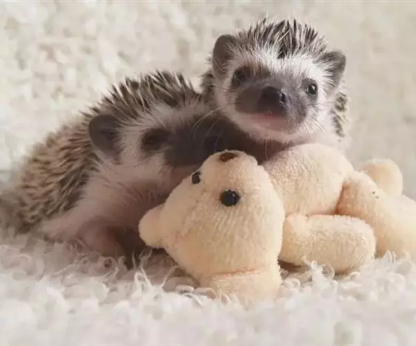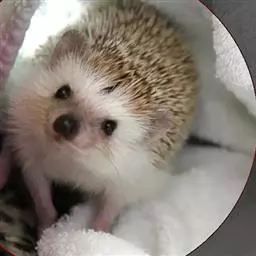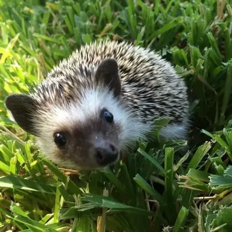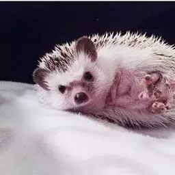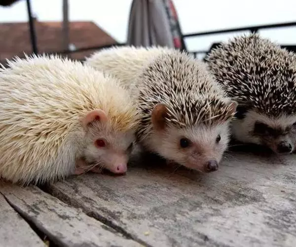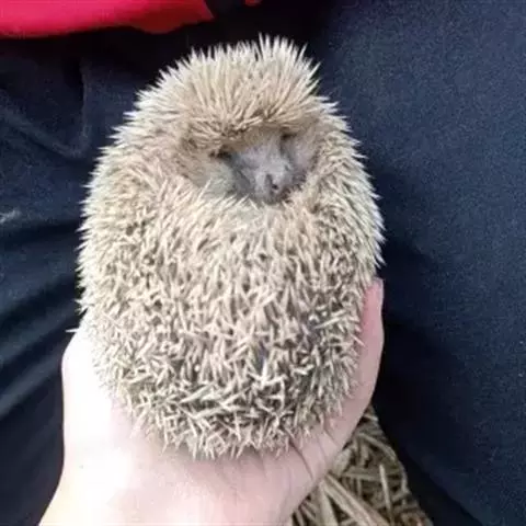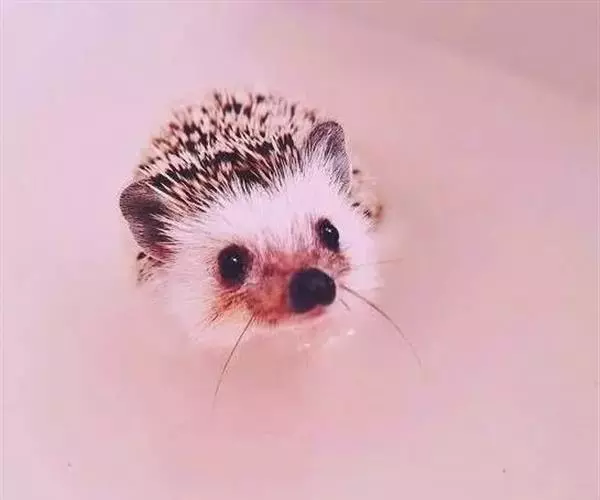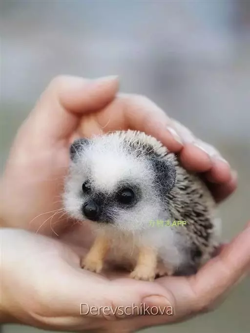 迷你刺猬 迷你刺猬处于宝宝期时只有人类手掌大小,酒杯或者汤匙能够轻松容纳它们。成年期的迷你刺猬,体重300多克,体长10-15厘米,腹部和脸是白色或奶油色的毛,白色的刺混杂著黑色或咖啡色;脸部也许会有较深的颜色像面具一般;脚上低一点的地方通常也会呈现较深的颜色;耳朵的高度比刺的长度短,被毛发环绕覆盖著。