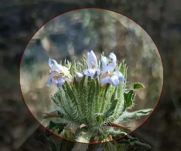 花序顶生及腋生,分枝,果期伸长,花序轴、苞片、花梗及花萼均被密糙伏毛;苞片线形至线状披针形;花梗近直立,长1-3毫米,果期伸长达1厘米;花萼长10-13毫米,5裂至近基部,裂片线状披针形,先端渐尖,果期长约1.8厘米;花冠蓝色,长达2厘米,筒部与萼等长或稍长,微弯曲,无毛,檐部直径约1.2厘米,裂片近圆形,宽约5毫米,喉部附属物画笔状,扁平,长约2毫米;雄蕊着生喉部之下,内藏,花药长约3毫米,花丝长约2.5毫米;花柱长1.1-1.3厘米,稍伸出喉部,柱头头状,微2裂。小坚果长约6毫米,有明显的网状皱褶及小疣点。