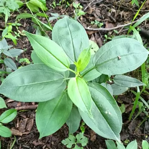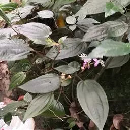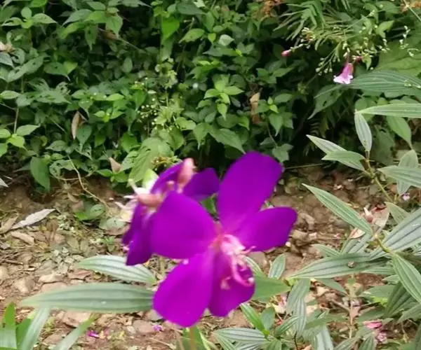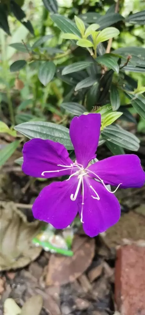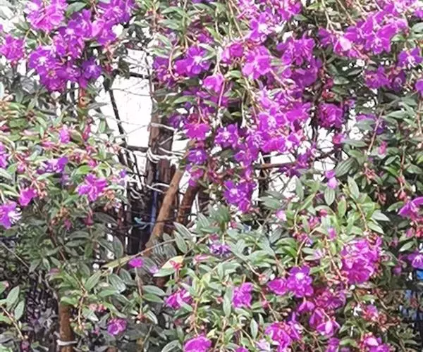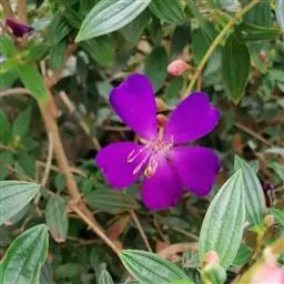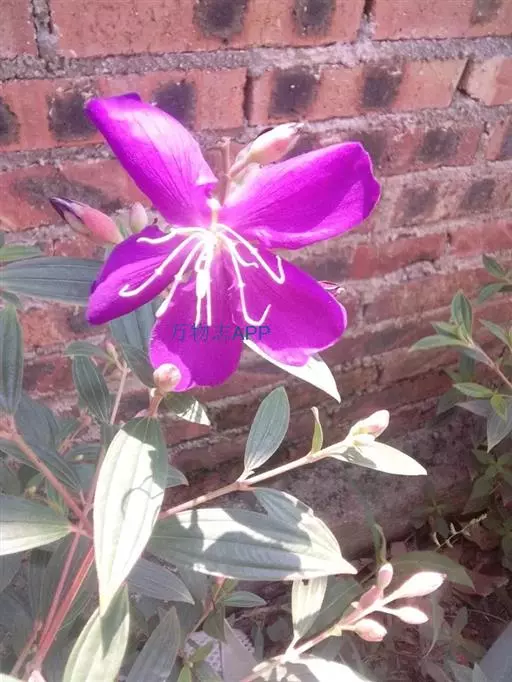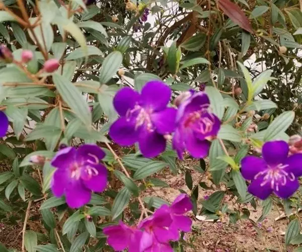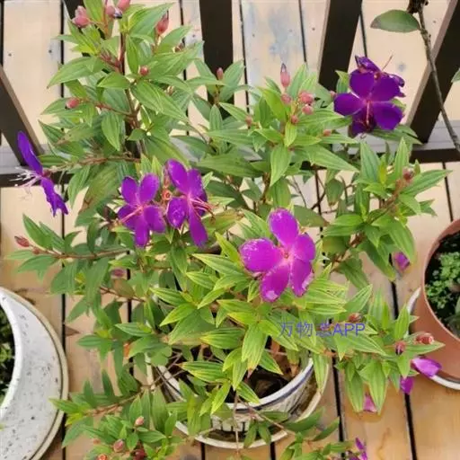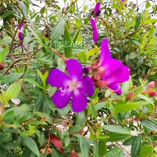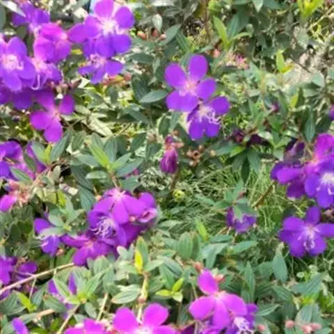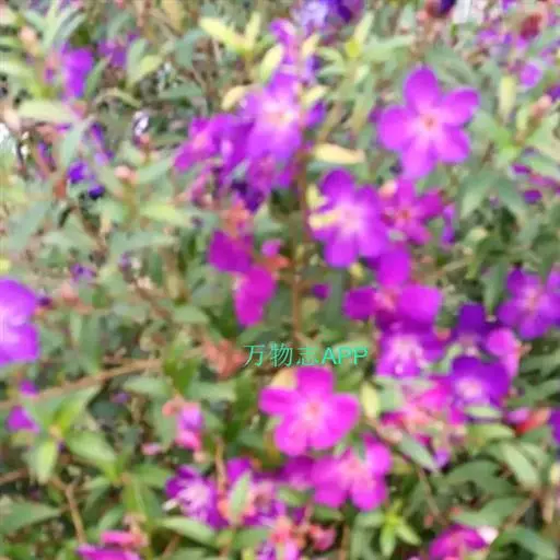 巴西野牡丹,常绿灌木,高0.6-1.5 米。茎四菱形,分枝多,枝条红褐色,株形紧凑美观;茎、枝几乎无毛。叶革质,披针状卵形,顶端渐尖,基部楔形,长3-7厘米,宽1.5-3厘米,全缘,叶表面光滑,无毛,5 基出脉,背面被细柔毛,基出脉隆起。