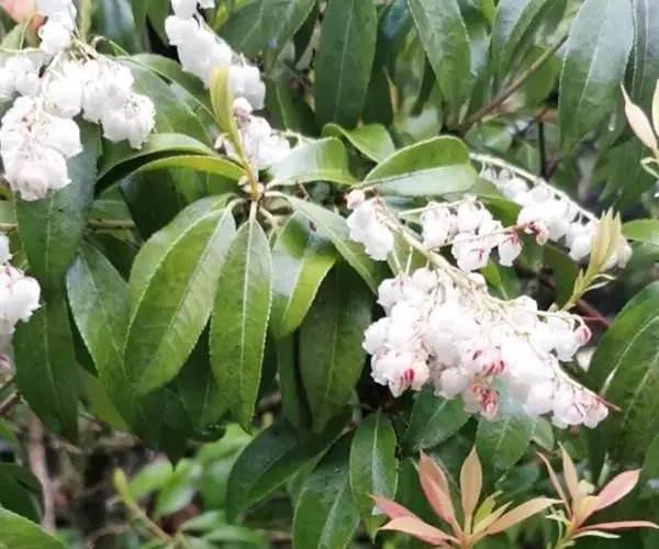 马醉木2-4月开花,总状花序,花序上有白色壶状小花数朵,排列别致有趣。马醉木树姿优美,因叶色随着叶的新老程度不同而变化,所以同一时期会同时拥有红、粉红、嫩黄、绿色等叶片,异彩纷呈,有着较高的观赏价值和园林应用价值。马醉木可应用于花篱和色块配置、块状种植和边缘灌木,色彩艳丽,萌发力强,它是园林绿化向高品位方向发展更新树种的理想选择之一,一年四季均可观赏,也可作为盆栽推广,是一种布置庭园的好材料。
