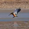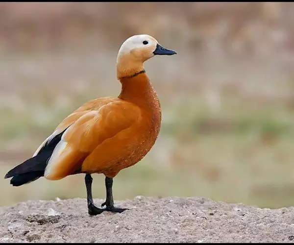 赤麻鸭(学名:Tadorna ferruginea)体型较大,体长51-68厘米,体重约1.5千克,比家鸭稍大。全身赤黄褐色,翅上有明显的白色翅斑和铜绿色翼镜;嘴、脚、尾黑色;雄鸟有一黑色颈环。飞翔时黑色的飞羽、尾、嘴和脚、黄褐色的体羽和白色的翼上和翼下覆羽形成鲜明的对照。栖息于开阔草原、湖泊、农田等环境中,以各种谷物、昆虫、甲壳动物、蛙、虾、水生植物为食。繁殖期4-5月,在草原和荒漠水域附近洞穴中营巢,每窝产卵6-15枚,卵椭圆形,淡黄色,雌鸟负责孵卵。主要繁殖于欧洲东南部、地中海沿岸、非洲西北部、亚洲中部和东部,越冬在日本、朝鲜半岛、中南半岛、印度、缅甸、泰国和非洲尼罗河流域等地。