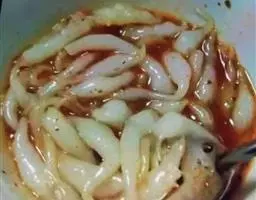 7.要到粘米粉出场了,把粘米粉用水兑开,不要粘稠状,要兑到液体状...等锅里汁液快熟的时候倒进锅里面,不停搅拌(前后搅拌)。