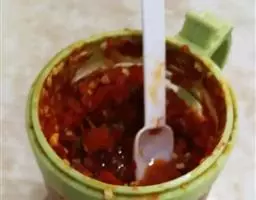 用菜油和红辣椒制成辣椒油,配以豆、酱、花椒粉、大蒜泥、小葱、芝麻、花生、香菜、酱油、醋、味精等制成调料淋入切好的凉粉中而成。