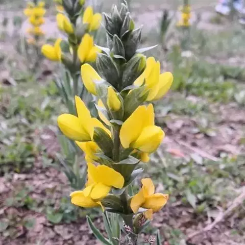 穗状花序常1至数个顶生和枝端腋生,长7-15厘米,密被短柔毛;花有短梗;苞片长3-4毫米;花萼长2-3毫米,被疏毛或几无毛,萼齿三角形,较萼筒短;旗瓣心形,紫色,无翼瓣和龙骨瓣;雄蕊10,下部合生成鞘,上部分裂,包于旗瓣之中,伸出花冠外。荚果下垂,长6-10毫米,宽2-3毫米,微弯曲,顶端具小尖,棕褐色,表面有凸起的疣状腺点。花、果期5-10月。
