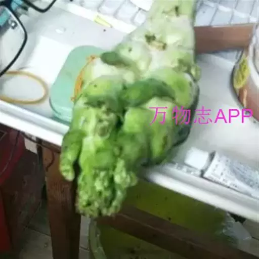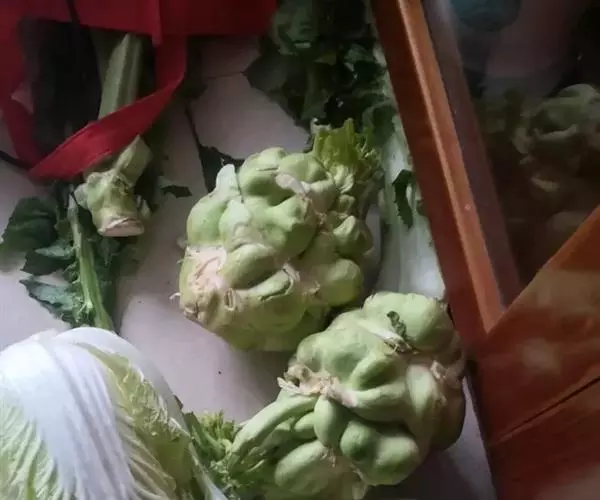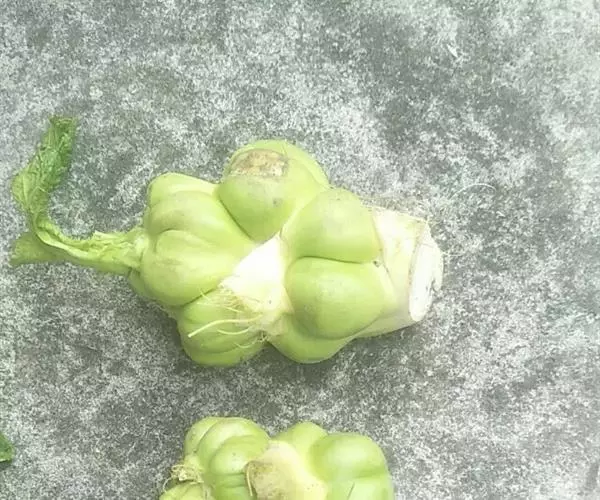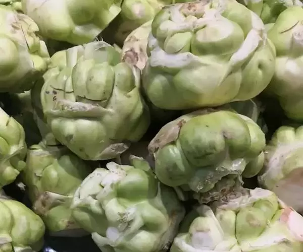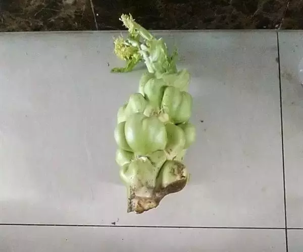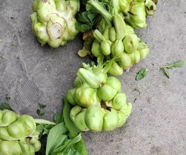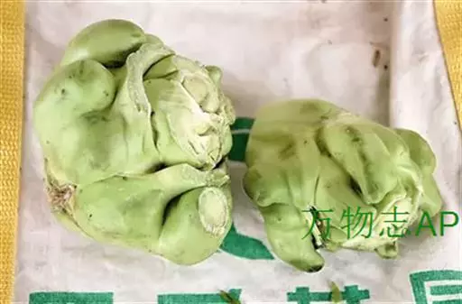 成熟的未抽薹以前的茎瘤芥,其地上部分高60~80cm,地下部分主根长20~30cm,整株一般重2~4kg。地上部分的下部为肥大的瘤茎,茎上长着十余片大叶;大叶的叶柄基部长着瘤状的肉质茎,明显的瘤状凸起一般3~5个。瘤茎表皮青绿光滑,皮下肉质色白而肥厚,质地嫩脆。瘤茎部分,即青菜头,一般每个重0.5kg左右,大者1~1.5kg。煮熟的青菜头拌上调料食用十分可口;其煮后的汤有一种鸡汤式的鲜味。用青菜头制成的泡菜,显得嫩脆别致 。