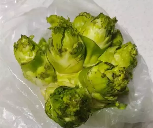 2、剥菜将青菜头基部老皮老筋剥去,不可损伤突起瘤及菜耳朵。