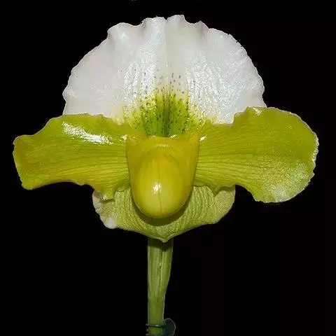 花葶近直立,长30-40(-60)厘米,绿色,密生白色短柔毛;总状花序具3-5 (-8)花;花苞片绿色,卵形或宽卵形,长2-2.5(-3)厘米,宽1.5-2.5厘米,膜质,背面基部偶见短柔毛;花梗和子房长3.5-4厘米,被短柔毛;花较大;中萼片与合萼片奶油黄色并有绿色脉,尤其在近基部处,花瓣基部至中部淡绿黄色并有栗色斑点和边缘,中部至末端近栗色,唇瓣绿色而有栗色晕,但囊内紫褐色;中萼片椭圆形或宽椭圆形,长3-4 (-5)厘米,宽2.5-3厘米,先端近急尖或短渐尖,边缘向后弯卷,背面近基部多少被毛;合萼片与中萼片相似,略小;花瓣长带形,下垂,长8-9厘米,宽6-8(-10)毫米,先端钝,强烈扭转,下部(尤其近基部处)边缘波状,偶见被毛的疣状突起或长的缘毛;唇瓣倒盔状,基部有宽阔的、长达1.4-1.6厘米的柄;囊近卵状圆锥形,长2-2.5厘米,宽1.5-2厘米,囊口极宽阔,两侧各有1个直立的耳,两耳前方的边缘不内折,囊底有毛;退化雄蕊倒卵形,长1-1.3厘米,宽7-8毫米,先端具弯缺或凹缺,基部收狭。花期6-7月。 [2-3]