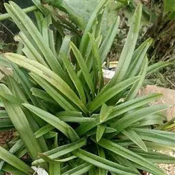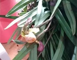 飘带兜兰 附生植物,较高大。叶基生,二列,5-8枚;叶片宽带形,厚革质,15-24 (-35)厘米,宽2.5-4(-5)厘米,先端圆形或钝并有裂口或弯缺,基部收狭成叶柄状并对折而彼此互相套叠,无毛。