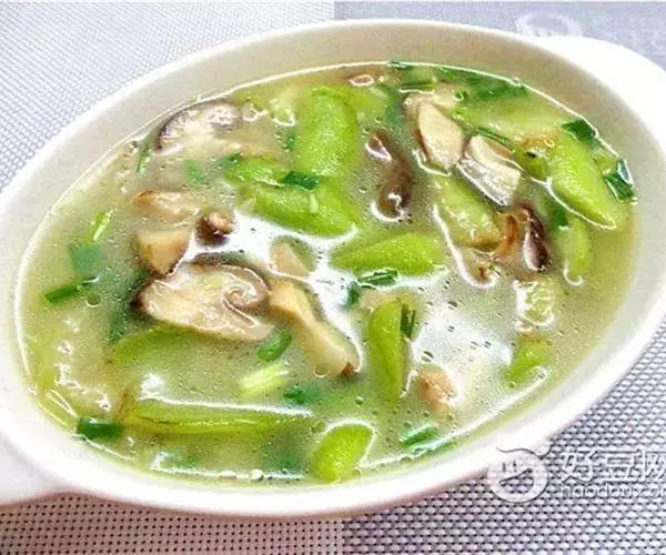 丝瓜香菇汤 将丝瓜洗净,去皮棱,切开,去瓤,再切成段;香菇用凉水发后,洗净。起油锅,将香菇略炒,加清水适量煮沸3-5分钟,入丝瓜稍煮,加葱、姜、盐、味精调味即成。