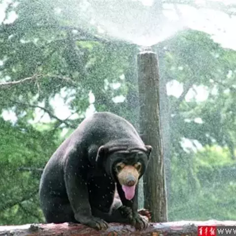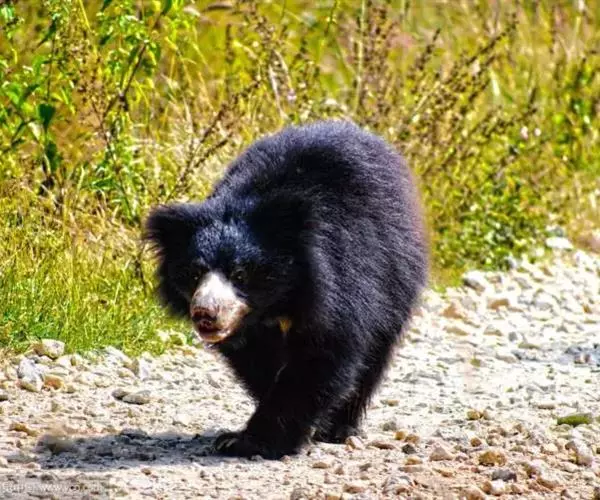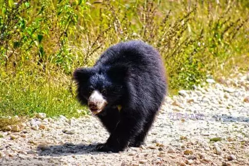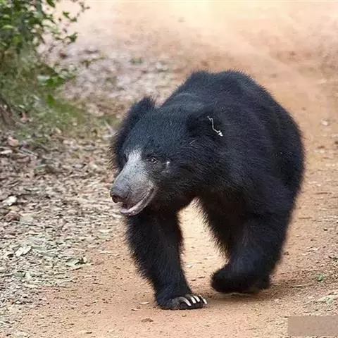 懒熊(学名:Melursus ursinus):属于熊科、懒熊属的动物。体型中等,雄性比雌性重30%至40%,雄性体重80-140千克,雌性体重55-95千克,成年懒熊的肩宽约60-90厘米,尾长15-18厘米,是熊科中最长的。懒熊全身覆盖长而蓬松的毛发,毛色浅的如赤褐色,深的可至黑色。胸部有个特别的浅的“V”字形或“ Y”形斑块,脸部毛发相对较少,毛色偏灰。吻部稍白,鼻子呈黑色。口鼻很长,能灵活移动,它们可以随意控制鼻孔闭合。懒熊的上颚只有4颗门齿,而不像很多其他种类的动物那样上下各有六颗,这样中间形成空隙就有助于它们吸食白蚁。