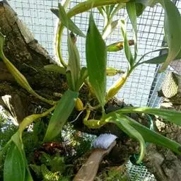 广东石斛:茎直立或斜立,细圆柱形,不分枝,具少数至多数节。叶革质,二列、数枚,互生于茎的上部,狭长…