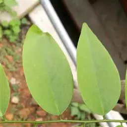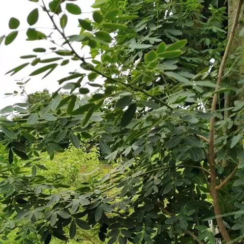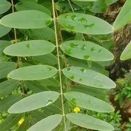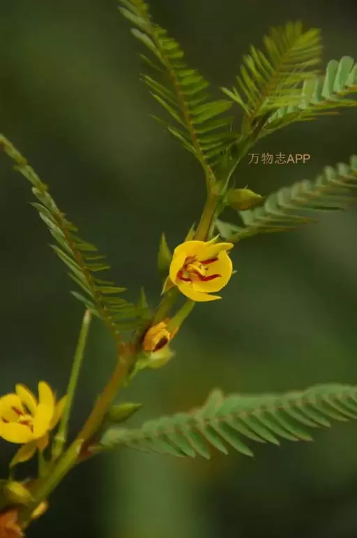 叶长4-8厘米,在叶柄的上端、最下一对小叶的下方有圆盘状腺体1枚;小叶20-50对,线状镰形,长3-4毫米,宽约1毫米,顶端短急尖,两侧不对称,中脉靠近叶的上缘,干时呈红褐色;托叶线状锥形,长4-7毫米,有明显肋条,宿存。