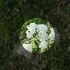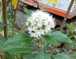 头状花序12-20个在茎枝顶端密集成团球状复头状花序,复头状花序基部有3个卵状心形的叶状苞片,具细长的花序梗,排成疏伞房状;总苞长圆形,长8-10毫米,宽1.5-2毫米;总苞片绿色,或有时顶端紫红色,外层4,披针状长圆形,长4-5毫米,顶端尖,具1脉,无毛或近无毛,内层4个,椭圆状长圆形,长7-8毫米,顶端急尖,具3脉,被疏贴短毛和腺点;花4个,花冠白色,漏斗状,长5-6毫米,管部细,裂片披针形,无毛。