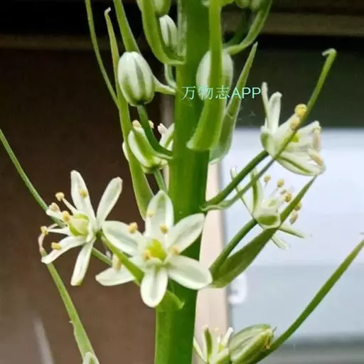 花葶高45-100厘米,较粗壮,常稍弯曲;总状花序长15-30厘米,排成顶生的总状花序或伞房花序,具多数、密集的花;苞片条状狭披针形,绿色,迅速枯萎,但不脱落;花被片6片,矩圆形,离生,宿存,长约8毫米,白色,中央有绿脊;雄蕊稍短于花被片,花丝下半部极扩大。 [1-2]