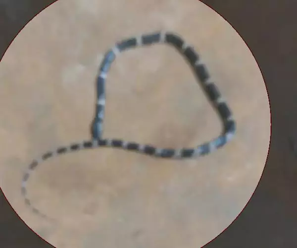 本品呈圆盘状,盘径3—6厘米,蛇体直径0.2—0.4厘米。头盘在中间,尾细,常纳口内,口腔上颌骨前端有毒沟牙一对,鼻间鳞二片,无颊鳞,上下唇鳞通常各为七片。背部黑色或灰黑色,有白色环纹45—58个,黑白相间,白环纹在背部宽1—2行鳞片,向腹面渐增宽,黑环纹宽3—5行鳞片,背正中明显突起一条脊棱,脊鳞扩大呈六角形,背鳞细密,通身15行,尾下鳞单行。气微腥,味微咸。