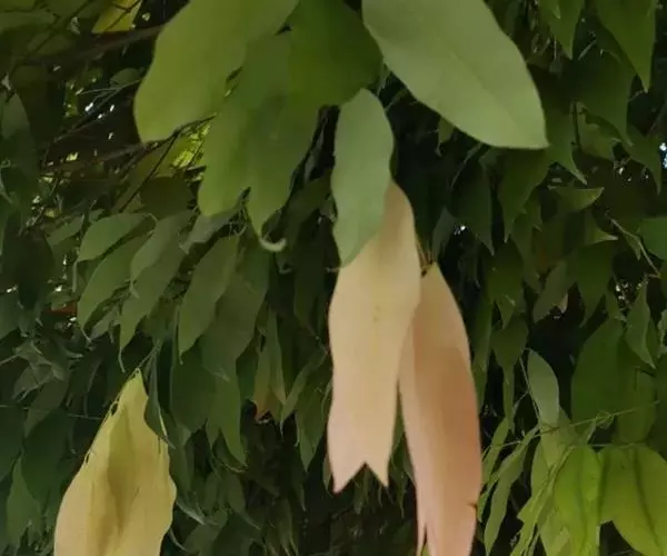 常绿乔木,具板状根,高20~30米,树干端直,树冠锥形,树皮薄,暗灰褐色, 铁力木 薄叶状开裂,创伤处渗出带香气的白色树脂。叶全缘,单叶对生。叶嫩时黄色带红,老时深绿色,革质,通常下垂,披针形或狭卵状披针形至线状披针形,长(4-)6~10(-12)厘米,宽(1-)2~4厘米,顶端渐尖或长渐尖至尾尖,基部楔形,上面暗绿色,微具光泽,下面通常被白粉,侧脉极多数,成斜向平行脉,纤细而不明显,网脉在放大镜下隐约可见;叶柄长0.5~0.8厘米。花芳香,两性,1-2顶生或腋生,直径5-8.5厘米;花梗长3~5毫米;萼片4枚,外方2枚较内方2枚略大,圆形,内凹,边缘膜质,有时具白色睫毛;花瓣4枚,白色,倒卵状楔形,长3~3.5厘米;雄蕊极多数,分离,花药长圆形,金黄色,长约1.5毫米,花丝丝状,长1.5~2厘米;子房圆锥形,高约1.5厘米,花柱长1~1.5厘米,柱头盾形。蒴果卵球形或扁球形,成熟时长2.5~3.5厘米,干后栗褐色,有纵皱纹,顶端花柱宿存,通常2瓣裂,基部具增大成木质的萼片和多数残存的花丝,果柄粗壮,长0.8~1.2厘米。种子1~4,背面凸起,腹面平坦或两面平坦;种皮褐色,有光泽,坚而脆。花期3~5月,果期8~10月。
