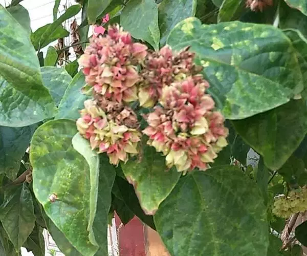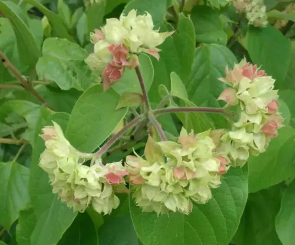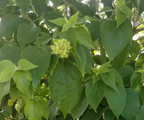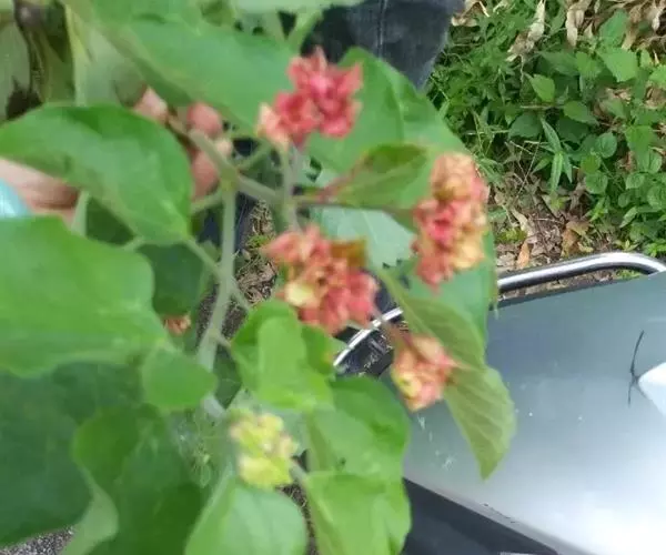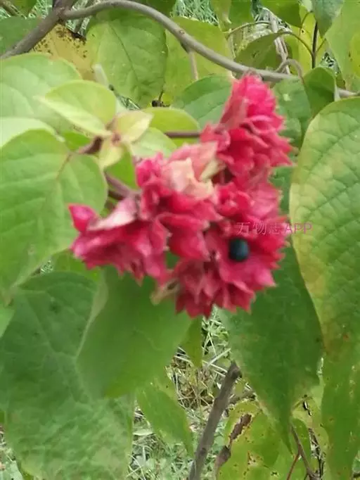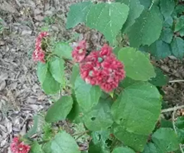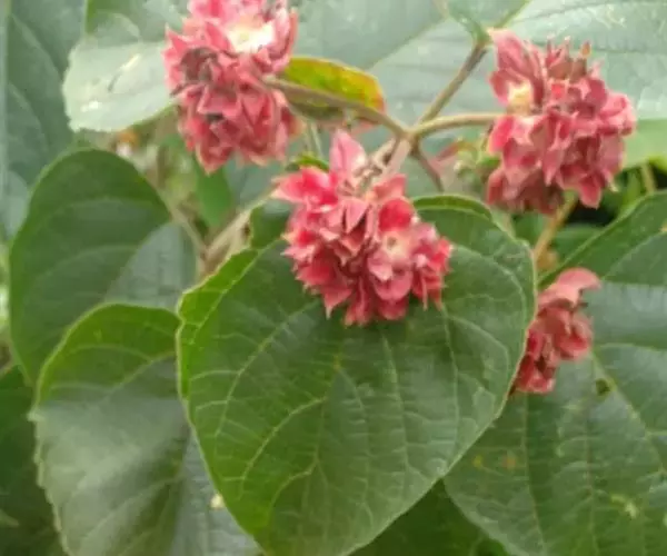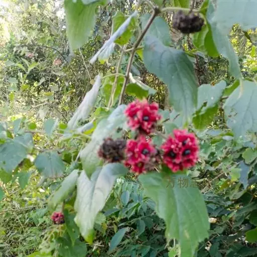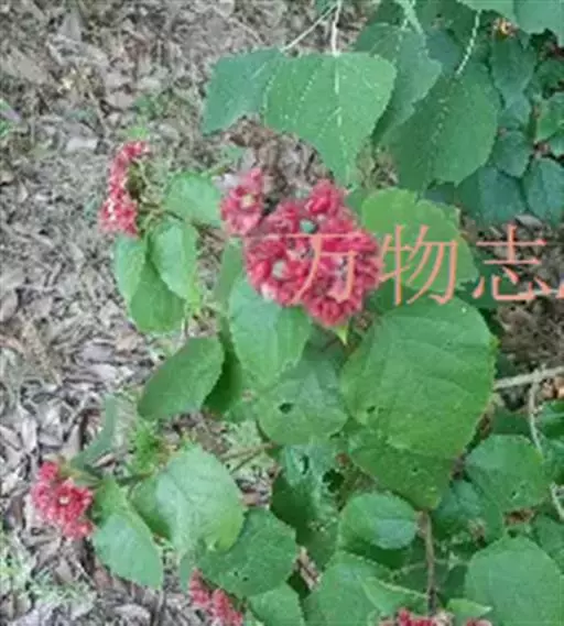 灌木,高1-3.5米;小枝略四棱形、具不明显的纵沟,全体密被平展或倒向灰褐色长柔毛,髓疏松,干后不中空。叶片心形或宽卵形,少为卵形,长6-18厘米,宽4-15厘米,顶端渐尖,基部心形至近截形,两面都有柔毛,脉上密被灰褐色平展柔毛,背面尤显著;叶柄长1.5-12厘米。聚伞花序密集成头状,通常2-5枝生于枝顶,花序梗较粗壮,长1.5-11厘米;苞片叶状,卵形或椭圆形,具短柄或近无柄,长0.5-2.4厘米;花萼由绿变红色,钟状,有5棱角,长约1.3厘米,有少数腺点,5深裂至萼的中部,裂片卵形或宽卵形,渐尖,花冠白色或淡红色,外有腺毛或柔毛,花冠管长约2厘米,纤细,裂片向外平展,倒卵状长圆形,长5-6毫米;雄蕊4枚,与花柱均伸出花冠外。核果近球形,径约7毫米,绿色,成熟时深蓝色或黑色,藏于红色增大的宿萼内。花果期4-10月。