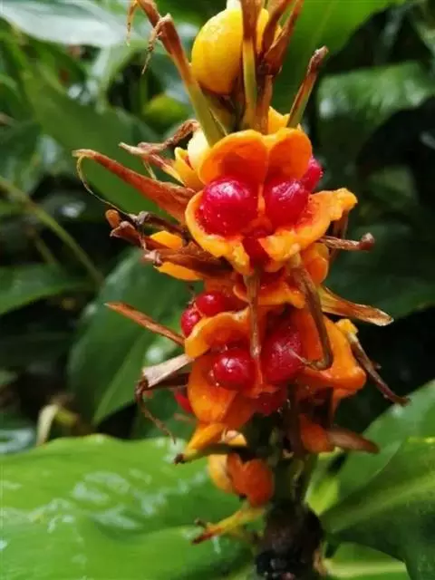 密苞山姜是姜科,山姜属多年生草本植物,株高可达1.5米。叶片椭圆状披针形,顶端渐尖,并具细尾尖,基…