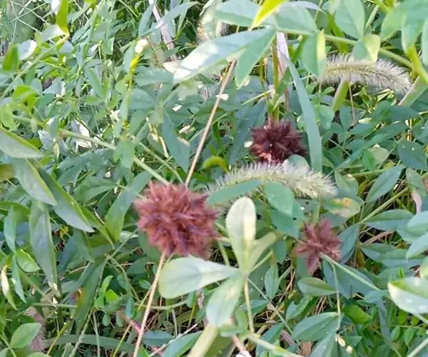 总状花序腋生,花密集成球状;总花梗短于叶,密生短柔毛及黄色鳞片状腺点;苞片卵状披针形,长6-8毫米,膜质,具腺点;花萼钟状,长4-5毫米,密被腺点,基部常疏被短柔毛;萼齿5,披针形,与萼筒近等长;花冠淡紫色、紫色或淡紫红色,旗瓣卵圆形,长6-8毫米,顶端圆,基部具短瓣柄,翼瓣长5-6毫米,龙骨瓣稍短于翼瓣。果序呈椭圆状,荚果卵圆形,长10-17毫米,宽6-8毫米,顶端具突尖,外面被长约5毫米刚硬的刺。种子2枚,黑色,圆肾形,长约2毫米。花期6-7月,果期7-9月。