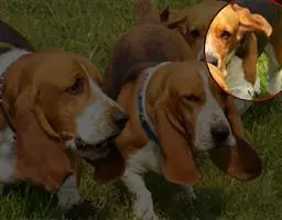 耳:两耳间距小、薄,呈V字形下垂、耳尖钝圆,耳长至咀角处。 鼻:宽阔,鼻镜黑色,白色犬允许肉色。