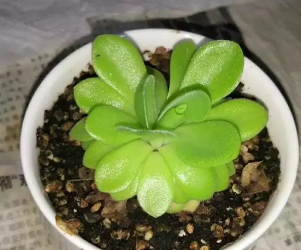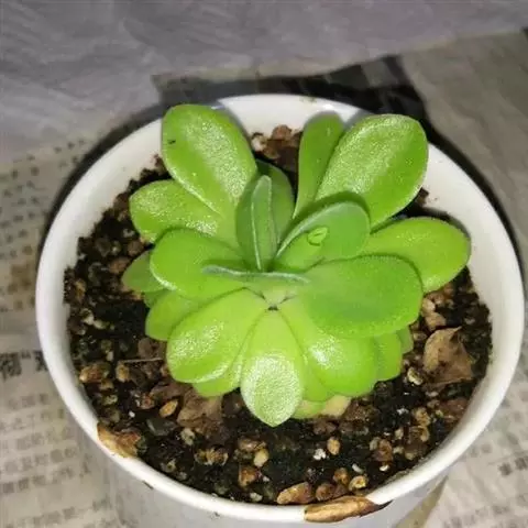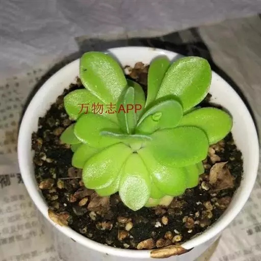 叶3-13,基生呈莲座状,脆嫩多汁,干时膜质;叶片长椭圆形,长1-4.5厘米,宽0.5-1.7厘米,边缘全缘并内卷,顶端钝形或圆形,基部宽楔形,下延成短柄,上面密生多数分泌粘液的腺毛,背面无毛,两面淡绿色,侧脉每边5-7条。