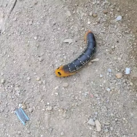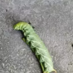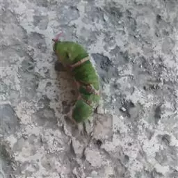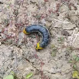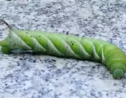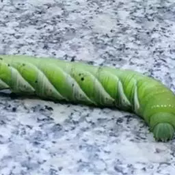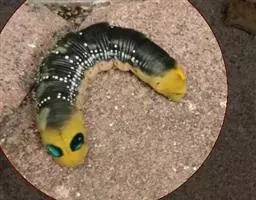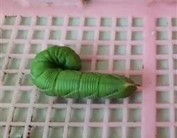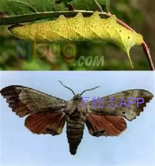 体长80mm,黄绿至绿色,体表密生黄白色颗粒。胸部侧面有一条、腹侧有7条黄色斜纹,自各节前缘下侧向上方斜伸,止于下l体节背侧近后缘,第7腹节者止于 尾角。尾角粗长,生于第8腹节背面。气门椭圆形,围气门片黑色。
