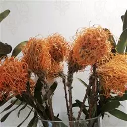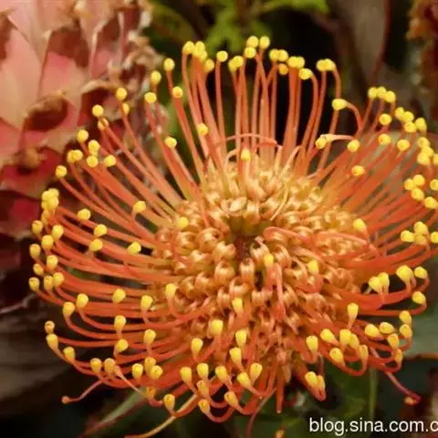 帝王花,山龙眼科帝王花属多年生常绿灌木植;茎干粗壮,叶色翠绿光亮;花朵呈圆球状;其苞片有的完全打开,…