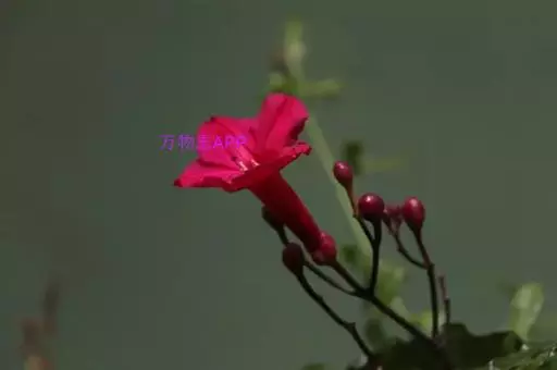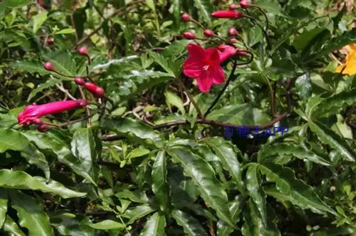 多年生常绿蔓性藤本,深褐色。叶互生,掌状深裂,小叶3~5片,长椭圆形至披针形,革质,具花泽。花腋生,花冠喇叭状,先端五裂,红色。
