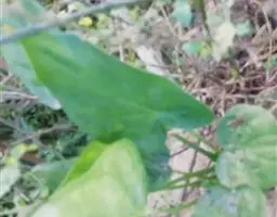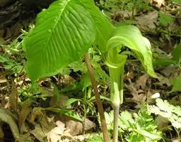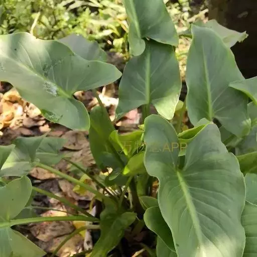 多年生粗壮草本,具块茎。叶基生,叶柄长0.4-1(-1.5)米,下部具鞘;叶片较厚,绿色,心状箭形或箭形,先端锐尖、渐尖或具尾状尖头,基部心形或戟形,全缘,长15-45厘米,宽10-25厘米,无斑块,后裂片长6-7厘米。花序柄长40-50厘米,光滑。
