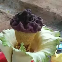佛焰苞长10-25厘米,管部短,黄色;檐部略后仰,锐尖或渐尖,具锥状尖头,亮白色,有时带绿色。肉穗花序圆柱形,长6-9厘米,粗4-7毫米,黄色:雌花序长1-2.5厘米;雄花序长5-6.5厘米。子房3-5室,渐狭为花柱,大部分周围有3枚假雄蕊。