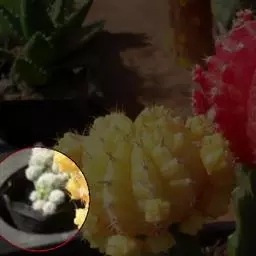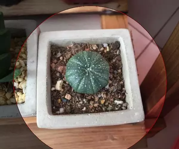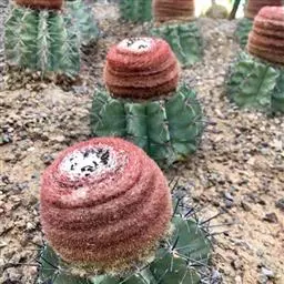 植株呈扁圆球形,直径5~8cm,球体由6~10条浅沟而分成6~10个扁圆棱。无刺,刺座上有白色星状 星兜、兜 绵毛。花着生于球顶部,漏斗形,黄色,花心红色,直径3~4cm。