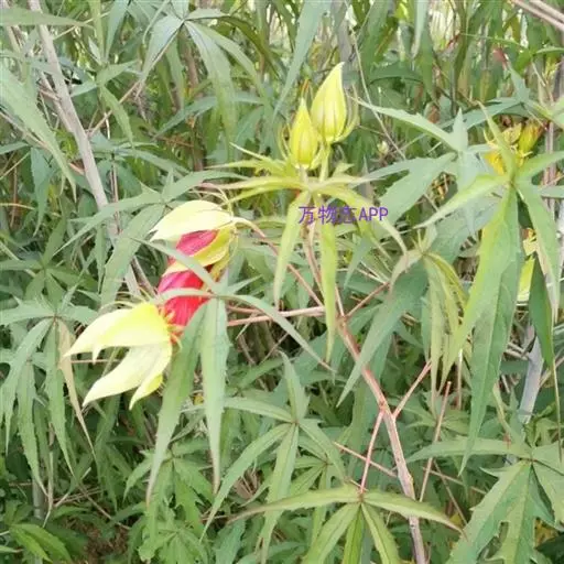 红秋葵为多年生直立草本,高1-3米,茎带白霜,无毛。叶指状5裂,裂片狭披针形,长6-14厘米,宽6-15毫米,先端锐尖,基部楔形,边缘具疏齿,两面均平滑无毛;叶柄长5-10厘米,平滑无毛。