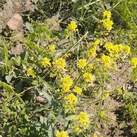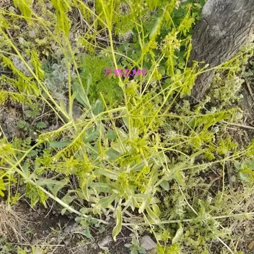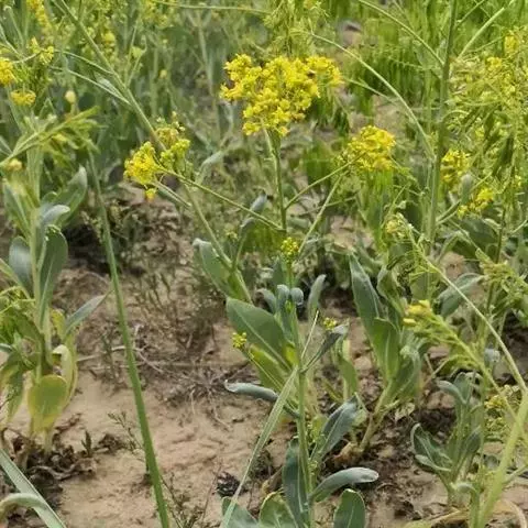 欧洲菘蓝 二年生草本,高30-80厘米。主根粗,径5-10毫米,灰黄色。茎直立,上部多分枝,无毛,稍有粉霜。基生叶有长柄,叶片长圆状椭圆形,基部渐狭,先端稍尖,通常全缘或略具波状齿;茎生叶无柄,披针形或长圆形,长3-6厘米,宽1-2厘米,基部箭形,抱茎,先端钝,全缘;茎上部叶线形。总状花序呈圆锥状;花黄色,直径7-10毫米;花梗纤细,下垂;萼片长圆形,开展,长约3毫米;花瓣狭倒卵形,长5-6毫米,有短爪;雄蕊6,花丝扁平,无牙齿;蜜腺在短雄蕊基部者呈环状,一侧微缺,在每对长雄蕊基部外侧者呈半月状;子房1室。短角果不开裂,两侧压扁,有翅,无隔膜,长圆形,长13-17毫米,宽3.5-5毫米,基部楔形,先端钝或微缺,具不明显肋。种子长圆状椭圆形,长约3毫米,黄褐色;子叶背倚。花期5月,果期6月。