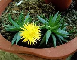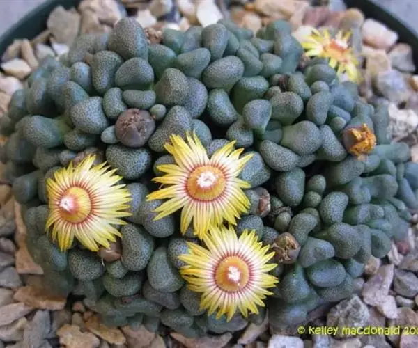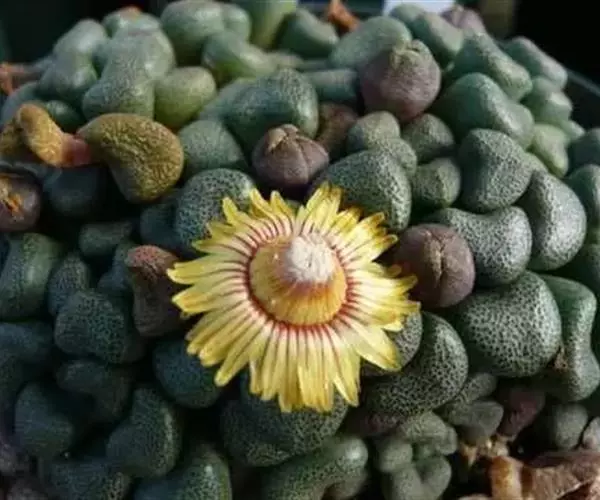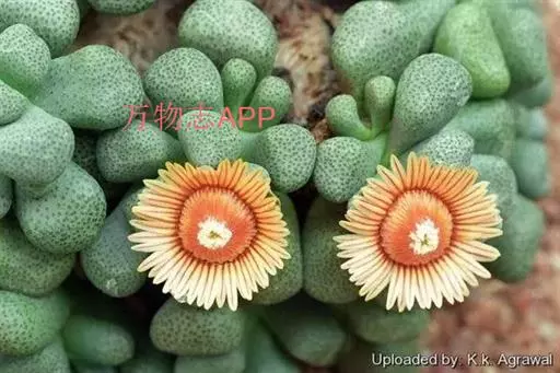 番杏科菱鲛属植物。产于南非开普省。小型的多年生肉质草本。有肉质根,几乎无茎。叶8一10,近似匙 唐扇 形,先端钝圆的三角形,肉质比叶下部明显厚,蓝绿色。叶总的来说很小,排列成松散的莲座形。植株丛生,具肥大的肉质根,无茎。叶8~10枚直接从根基部长出,排列成松散的莲座状,叶肉质,很小,近似匙形,先端为浑圆的三角形,叶蓝绿或褐绿色,密布深色舌苔状小疣突。花朵直径1~2厘米,花色黄、红相间,有丝绸般的光泽。花期春末夏初,通常在阳光充足的午后开放,傍晚闭合,第二天照旧开放、闭合,如此昼开夜闭,单朵花可持续开放3~5天。
