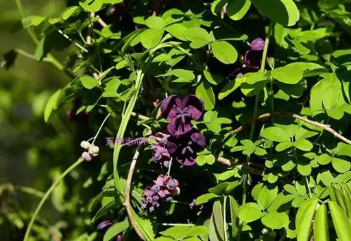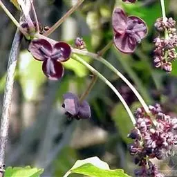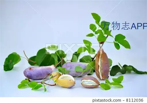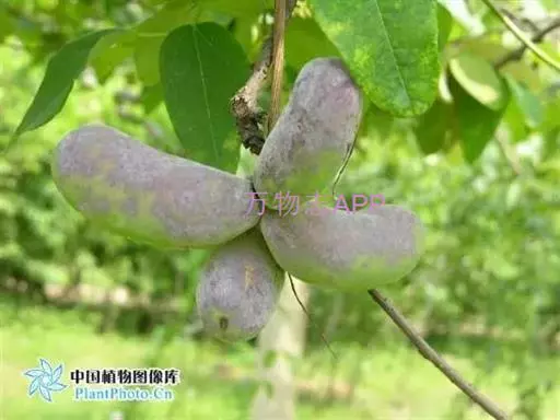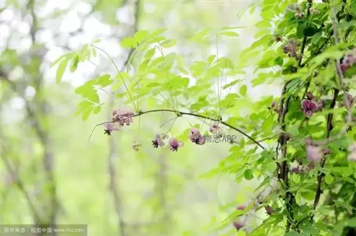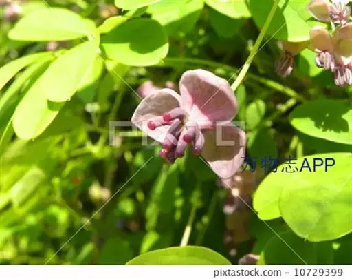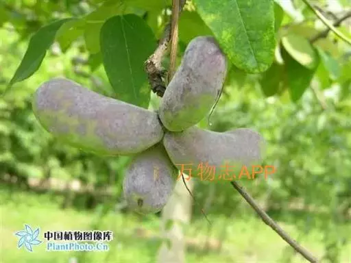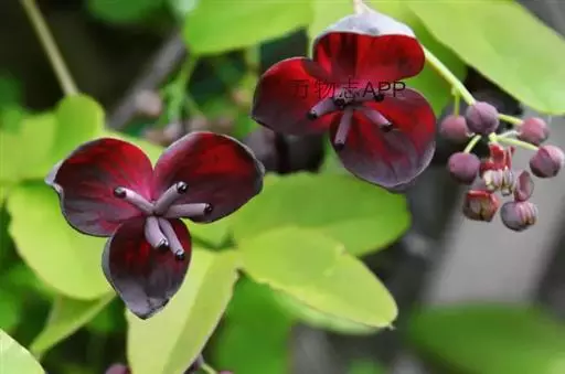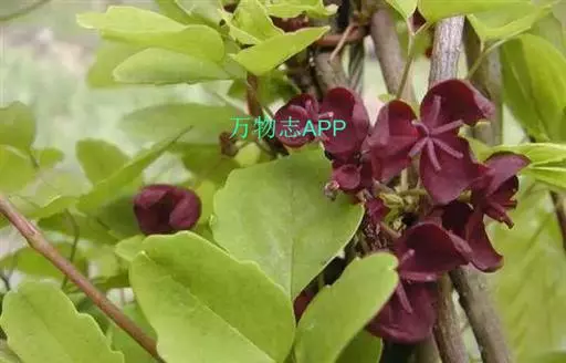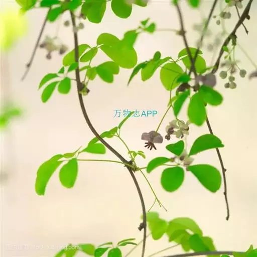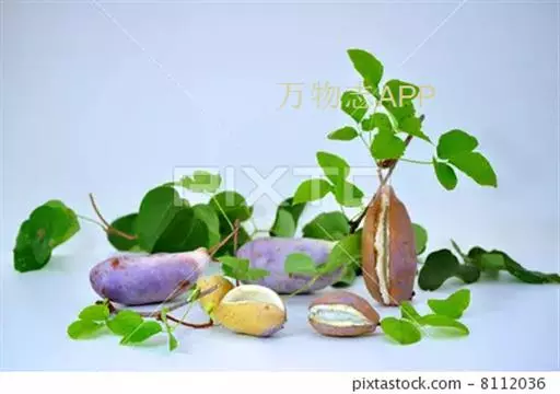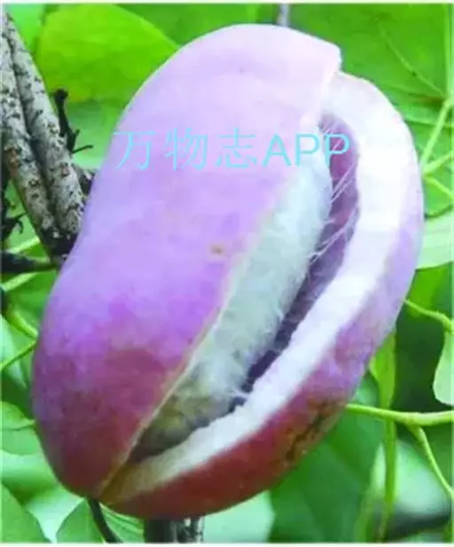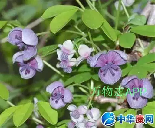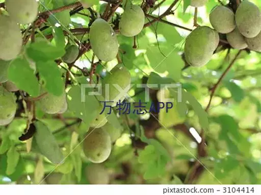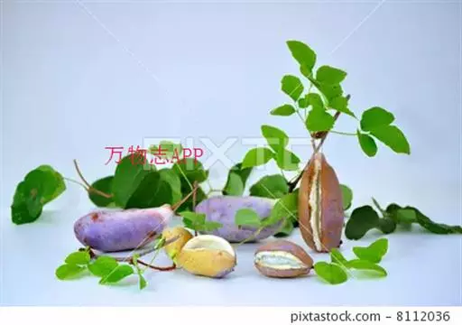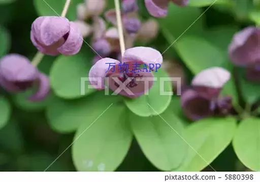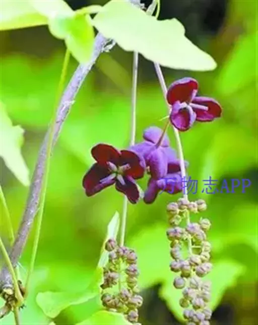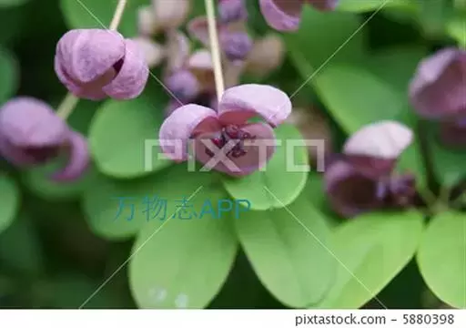 植物五叶木通,别名木通《中国植物志》。落叶木质缠绕藤本,长3~15米,全体无毛。幼枝灰绿色,有纵纹。掌状复叶,簇生于短枝顶端;叶柄细长。夏季开紫色花,短总状花序腋生。果肉质,浆果状,长椭圆形,略呈肾形,两端圆,长约8厘米,直径2~3厘米,熟后紫色,柔软,沿腹缝线开裂。种子多数,长卵形而稍扁,黑色或黑褐色。