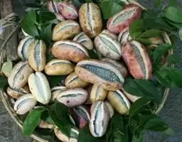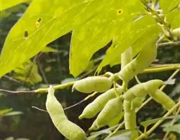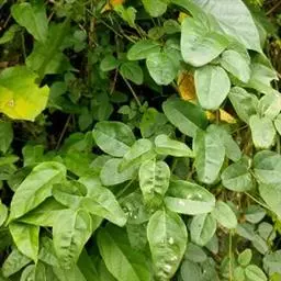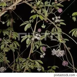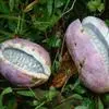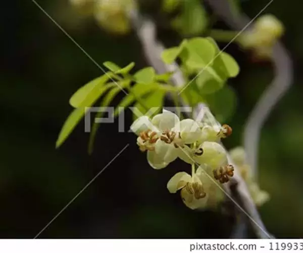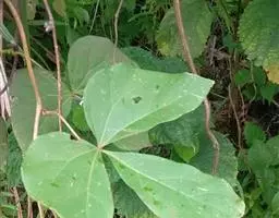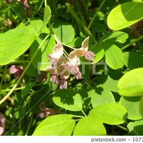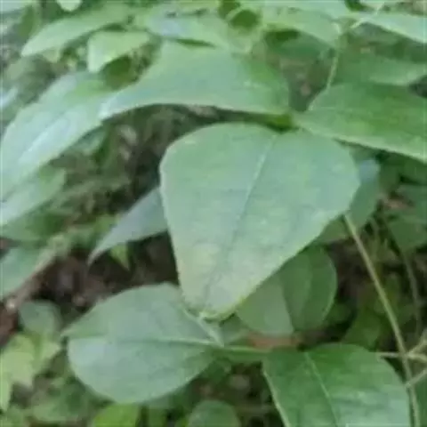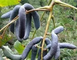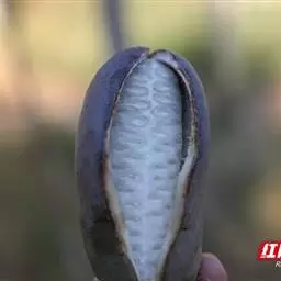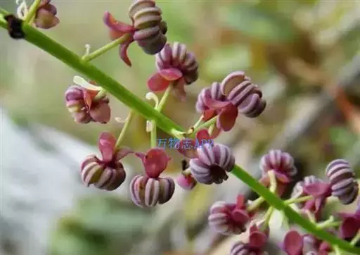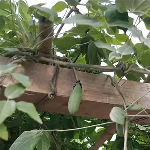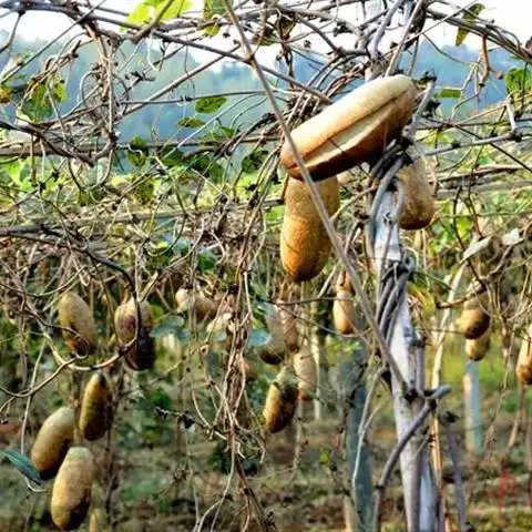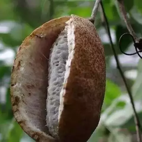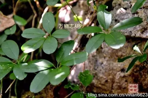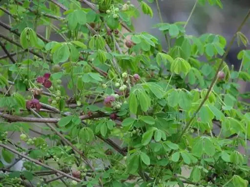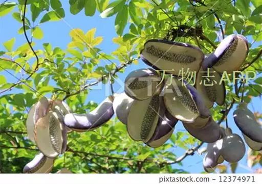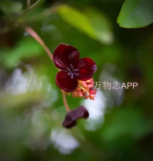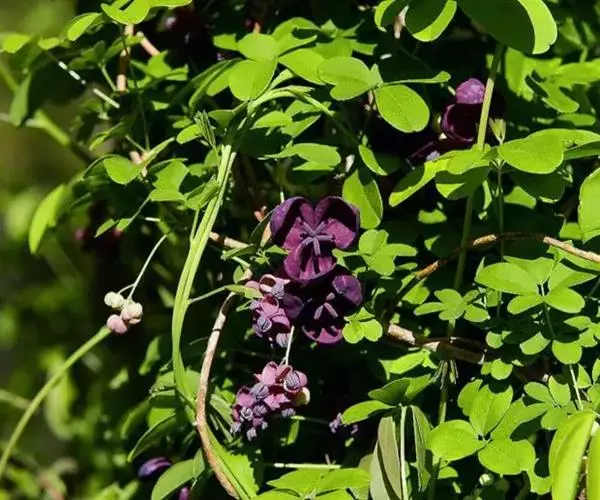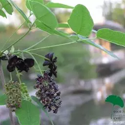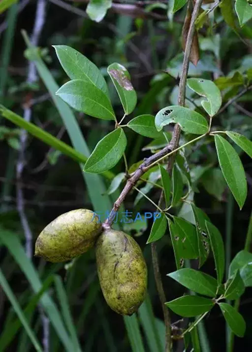 植物五叶木通,别名木通《中国植物志》。落叶木质缠绕藤本,长3~15米,全体无毛。幼枝灰绿色,有纵纹。掌状复叶,簇生于短枝顶端;叶柄细长。夏季开紫色花,短总状花序腋生。果肉质,浆果状,长椭圆形,略呈肾形,两端圆,长约8厘米,直径2~3厘米,熟后紫色,柔软,沿腹缝线开裂。种子多数,长卵形而稍扁,黑色或黑褐色。