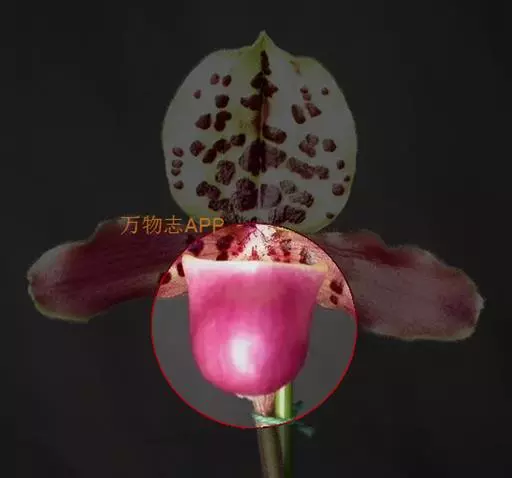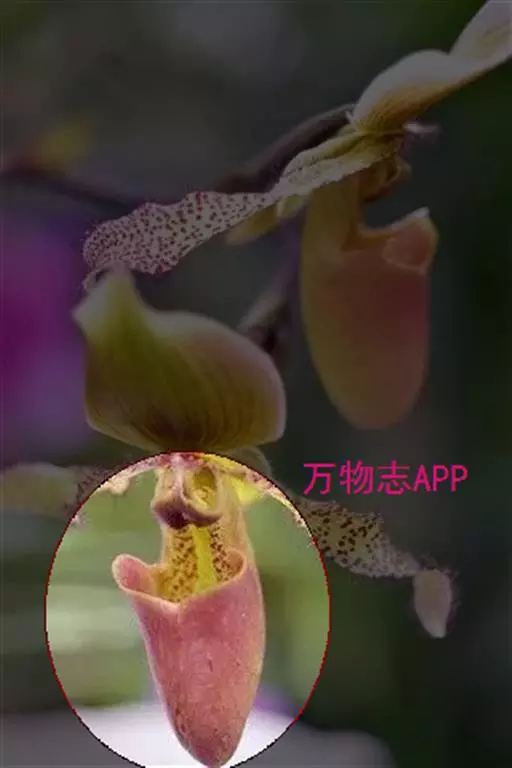 花葶直立,长20-30厘米,通常绿色并被深紫色长柔毛,基部常有长鞘,顶端生1花;花苞片宽卵形,长8-15毫米,宽8-11毫米,先端钝,背面密被长柔毛,边缘具长缘毛;花梗和子房长4-5厘米,具6纵棱,棱上密被长柔毛;花较大,中萼片和合萼片除边缘淡绿黄色外,中央至基部有浓密的紫褐色斑点或甚至连成一片,花瓣下半部黄绿色而有浓密的紫褐色斑点,上半部玫瑰紫色并有白色晕,唇瓣淡绿黄色而有紫褐色小斑点,退化雄蕊与唇瓣色泽相似,有2个白色“眼斑”;中萼片宽卵形或宽卵状椭圆形,长3.5-4厘米,宽3-3.5厘米,先端钝,背面被疏柔毛,边缘具缘毛;合萼片卵形,长3-3.5厘米,宽1.8-2.5厘米,亦具类似的柔毛与缘毛。
