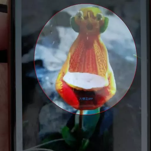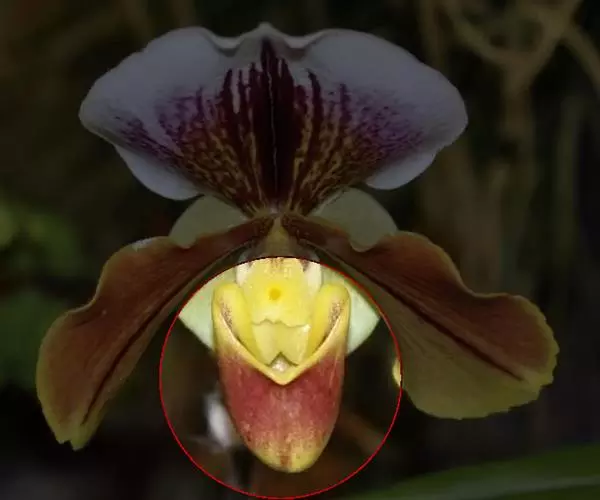 花瓣匙形或狭长圆状匙形,长5-7.5厘米,宽2-2.5厘米,先端常近截形或微凹,稍扭转,下部边缘皱波状且上面有时有黑色毛,边缘有缘毛,内表面基部有毛或近无毛;唇瓣倒盔状,基部具宽阔的、长约1.5厘米的柄;囊椭圆状圆锥形或近狭椭圆形,长2.5-3.5厘米,宽2-2.5厘米,囊口极宽阔,两侧各有1个直立的耳,两耳前方边缘不内折,囊底有毛;退化雄蕊近正方形,长与宽各8-10毫米,顶端近截形或有极不明显的3裂,基部有钝耳,上面中央和基部两侧各有1枚突起物,中央1枚较大,背面有龙骨状突起。花期4-5月。