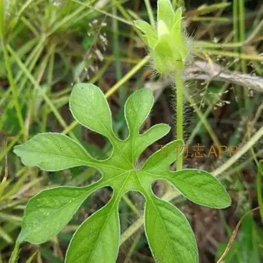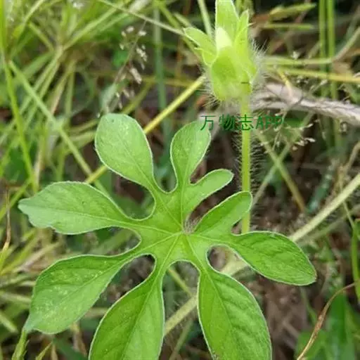 一年生缠绕草本或有时平卧,茎具细棱,被开展的灰白色硬毛。叶片轮廓近圆形或横向椭圆形,长2-10厘米,宽3-13厘米,掌状(3-)5-7(-9)深裂,裂片椭圆形或长椭圆形,顶端钝圆,锐尖至渐尖,有小短尖头,基部收缢,两面被疏长微硬毛;叶柄长2-8厘米,毛被同茎。聚伞花序有数朵花,密集成头状,腋生,花序梗长4-l1厘米,毛被同茎;具明显的总苞,外层苞片长圆形,长2-2.5厘米,内层苞片较小,卵状披针形,两面均被疏长硬毛;近于无花梗;萼片披针形,外萼片长1-1.4厘米,内萼片较短小,两面均被长硬毛,外面的更长;花冠未见,据记载:白色,漏斗状,约长3-4厘米,瓣中带散生毛;雄蕊花柱内藏,花丝无毛;子房无毛。蒴果卵球形,高约7毫米,2室。种子4,椭圆形,长4毫米,表面被灰白色短绒毛。