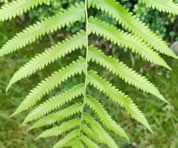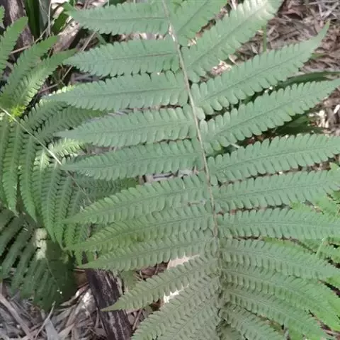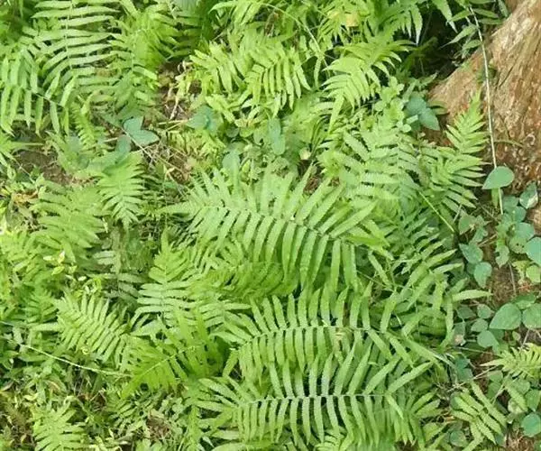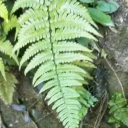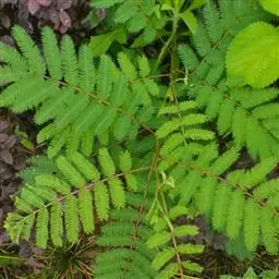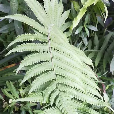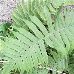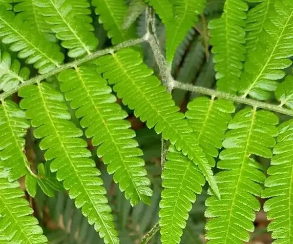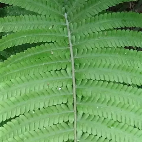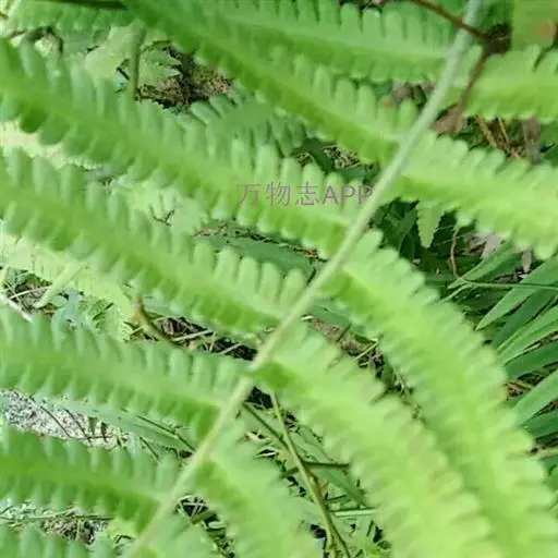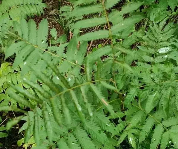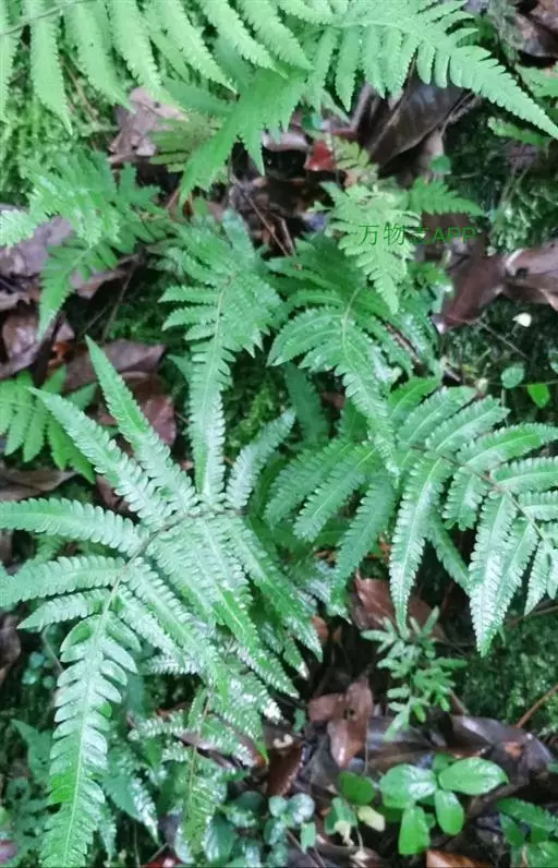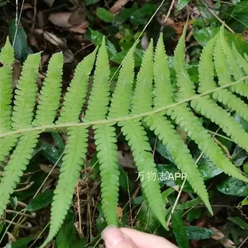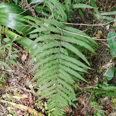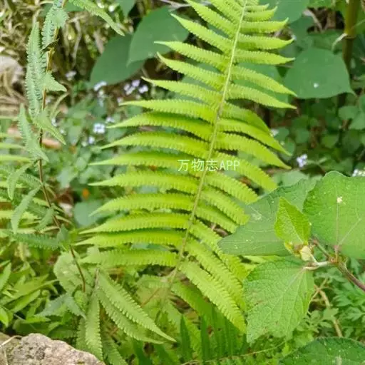 毛蕨 植株高达130厘米。根状茎横走,粗约5毫米,黑色,连同叶柄基部偶有一二卵状披针形鳞片。叶近生;叶柄长约70厘米,粗2~3毫米,基部黑褐色,向上渐变为禾秆色,几光滑;叶片长约60厘米,宽20~25厘米,卵状披针形或长圆披针形,先端渐尖,并具羽裂尾头,基部不变狭,二回羽裂;羽片22~25对,顶生羽片长约5厘米,基部宽约1.8厘米,三角状披针形,渐尖头,基部阔楔形,柄长约5毫米,羽裂达2/3,侧生中部羽片几无柄,斜向上,互生(基部的对生),相距约2厘米,近线状披针形,先端渐尖,基部楔形,对称,羽裂达1/3;裂片约30对,斜展,长宽各约3~4毫米,三角形,尖头。叶脉下面明显,每裂片有侧脉8~10对,基部一对斜展,其上侧一脉出自主脉基部,下侧一脉出自羽轴,二者先端交结成一个钝三角形网眼,并自交结点向缺刻下的膜质联线伸出外行小脉;第二对侧脉斜伸到膜质联线,在主脉两侧形成两个斜长方形网眼;第三对侧脉伸达缺刻以上的叶边。叶近革质,干后褐绿色,上面光滑,下面沿各脉疏生柔毛及少数橙红色小腺体,并沿羽轴有一二淡棕色鳞片;鳞片膜质,阔卵形,有缘毛。孢子囊群圆形,生于侧脉中部,每裂片5~9对,下部1~2对不育,因此在羽轴两侧各形成一条不育带;囊群盖小,膜质,淡棕色,上面疏被白色柔毛,宿存,成熟时隐没于囊群中。染色体2n=72,144。