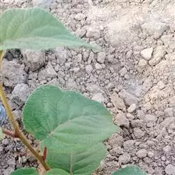 叶坚纸质,通常为阔卵形,有时近圆形或长卵形,长8-13 厘米,宽5-8.5厘米,最大可达15×12厘米,顶端短尖至渐尖,基部浑圆或浅心形、截平形和阔楔形,等侧或稍不等侧,边缘具疏生的突尖状硬头小齿,腹面草绿色或榄绿色,无毛,有光泽,背面密被灰色至黄褐色短度的紧密的星状绒毛,或较长的疏松的星状绒毛,侧脉6-7对,横脉显著可见,网状小脉不易见;叶柄长3-7厘米,无毛或略被微茸毛。