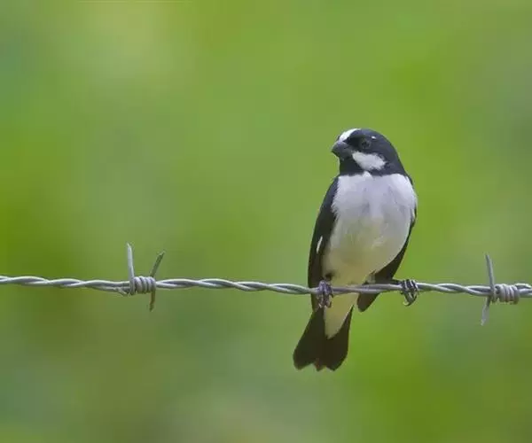 体型与麻雀相似。头黑色,两侧具大形白斑;上体蓝灰,背沾绿色;腹面白色,中央贯以显著的黑色纵纹。鸣声的基调似“呼伯、呼伯”或“呼黑、呼黑”,易与其它鸟类区别 。