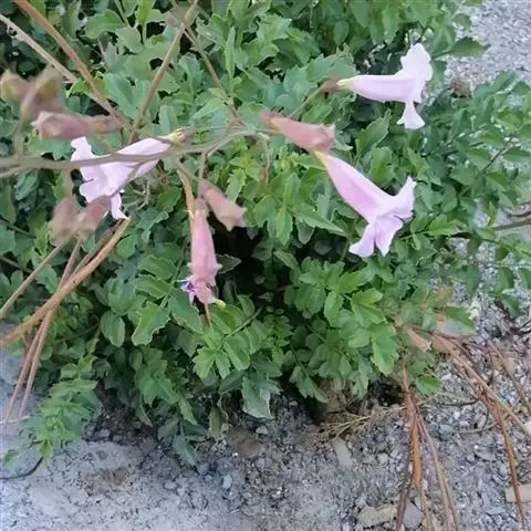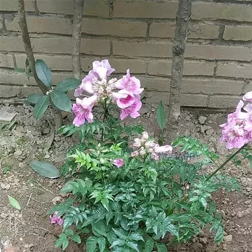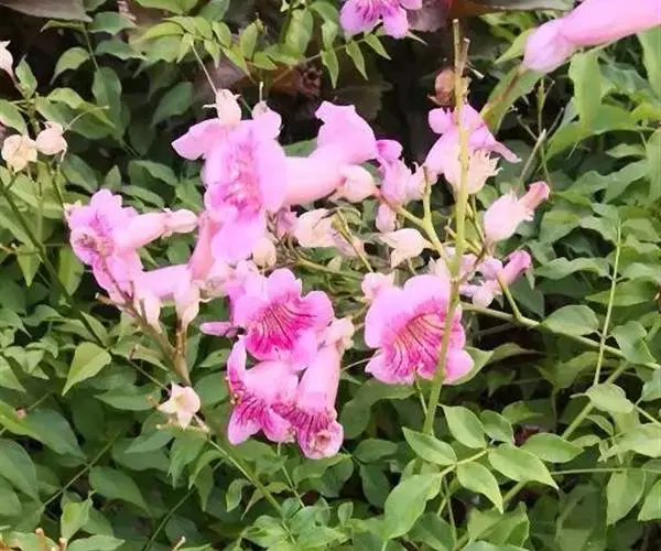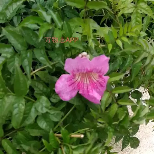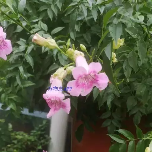 粉花凌霄 K.Schum.)是紫葳科魔盒凌霄属的落叶藤本植物。奇数羽状复叶对生,小叶全缘,…